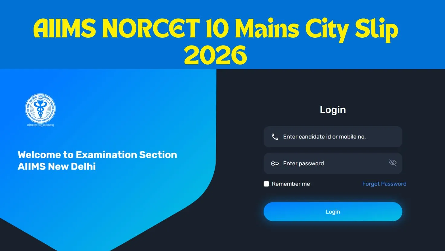 AIIMS NORCET 10 City Slip 2026: The All India Institute of Medical Sciences (AIIMS) has officially released the city slip for the AIIMS NORCET 10 CBT 2 Mains exam on 23 April 2026. The candidates who are going to appear for the AIIMS NORCET 10 Stage 2 examination can download their exam city slip from the official website by logging in to their account by entering candidate ID or mobile number and password.