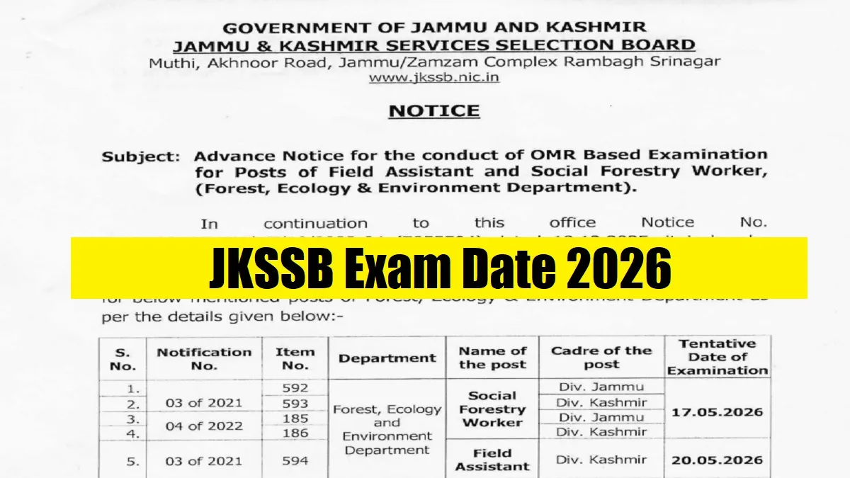 JKSSB Exam Date 2026: The Jammu and Kashmir Subordinate Selection Board (JKSSB) has released the detailed exam schedule for the posts of Field Assistant and Social Forestry Worker. The board will be conducting the OMR based written exam for these posts on May 17 and 20, 2026 across the state. The hall ticket will be available to download for these posts seven days to the date of examinations. All those candidates who have applied successfully for these posts can download the detailed exam schedule pdf through the link at jkssb.nic.in.