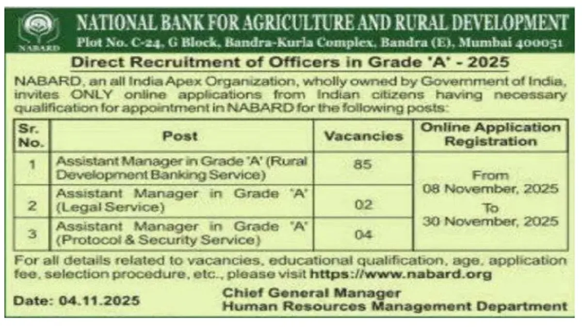 The online application process will commence from November 08, 2025. Interested and eligible candidates can apply online for these posts on or before November 30, 2025 at nabard.org.