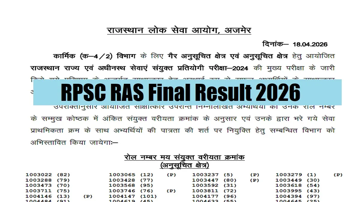 RPSC RAS Final Result 2026 Out: The Rajasthan Public Service Commission (RPSC) has announced the results of the Combined Merit List For Raj. State And Sub. Services Comb. Comp. Exam. Candidates part of selection process for various round for Combined Merit List For Raj. State And Sub. Services Comb. Comp. Exam can download RAS Result by visiting the official website i.e. rpsc.rajasthan.gov.in. The result has been released in pdf format containing the roll and name of the shortlisted candidates.