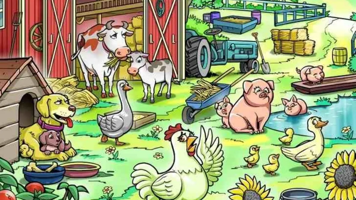 This charming cartoon illustration brings an interesting mind-boggling challenge for your brain. In this classic farmyard filled with animals chilling under a bright blue sky full of fluffy clouds and soaring birds, there is a hidden challenge awaiting you.
