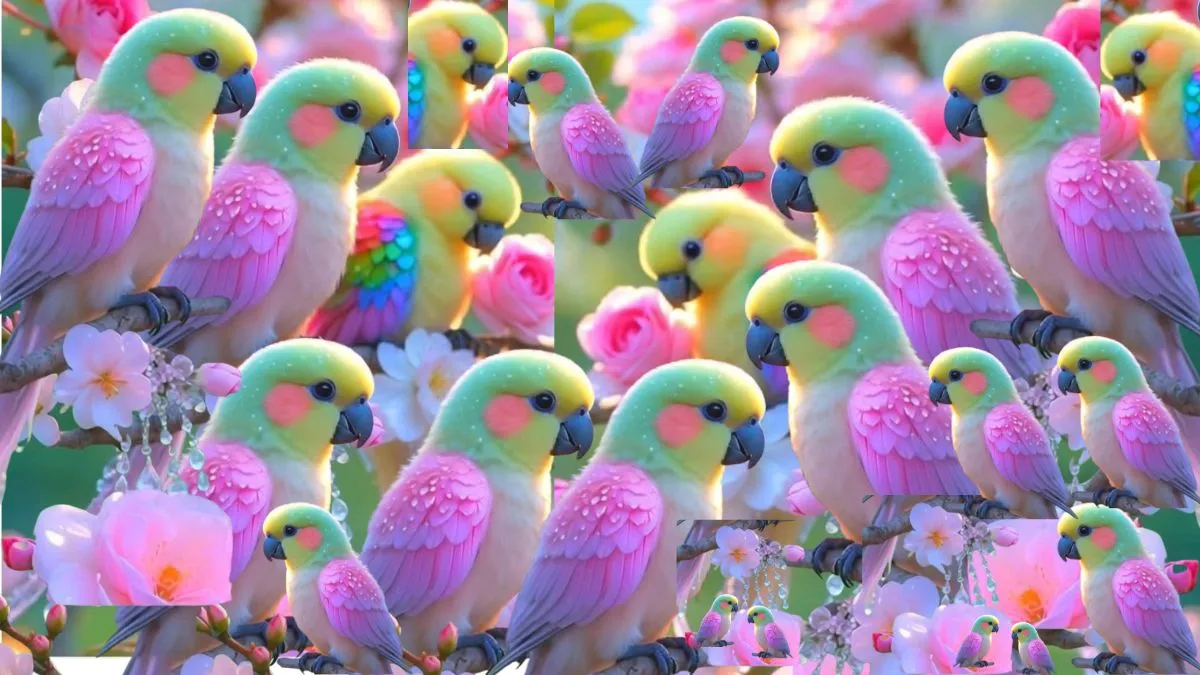 This image is a vibrant, digitally created collage featuring a large number of colourful parrots perched among soft pink roses and blossoms. The parrots are stylised with a blend of pastel green, yellow, and pink plumage, giving the scene a whimsical and dreamlike quality. So, these optical illusion generally occurs because the brain processes visual information by drawing on past experiences, context, and patterns, which can sometimes lead to incorrect conclusions. Optical illusions can occur due to factors like perspective, light, colour, movement, or the arrangement of shapes.