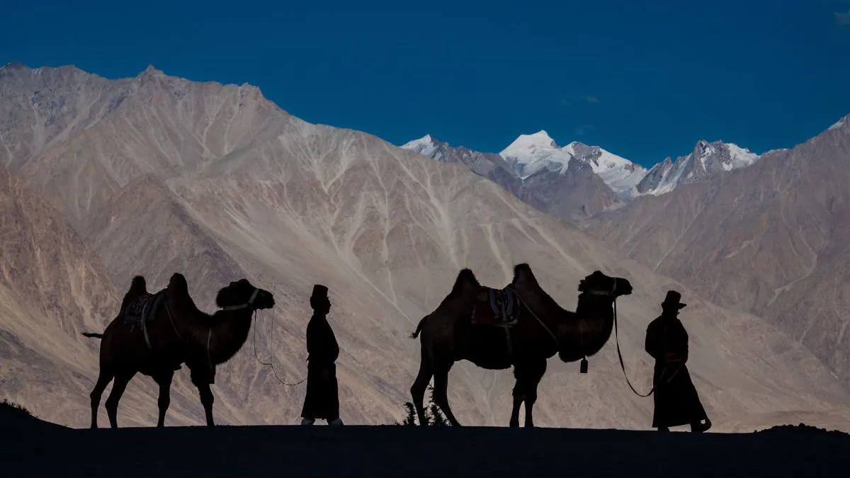 These Bactrian camels have thick fur, two humps for fat storage, and the ability to survive icy temperatures. They are used for transport in Nubra Valley.