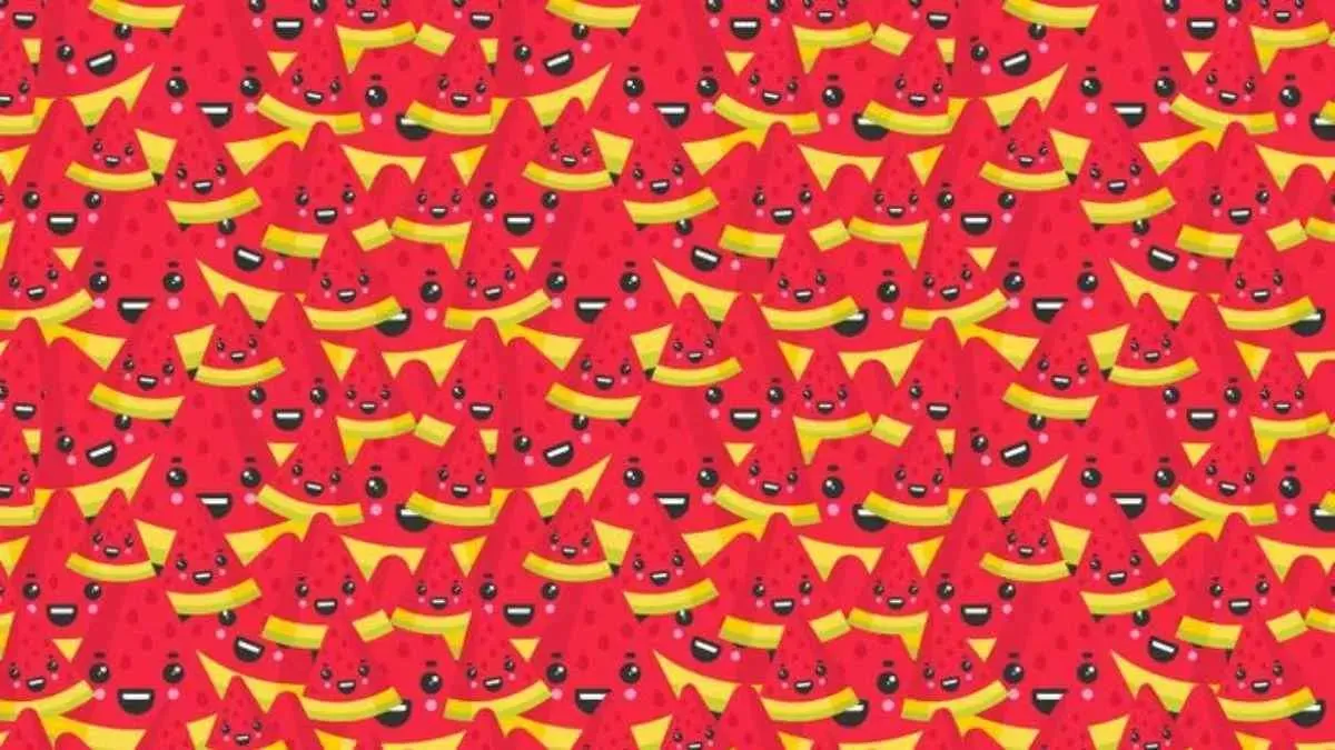 This optical illusion will test your ability to scan for an object hiding in plain sight among identicals. In this image, a strawberry that's hiding in plain sight among watermelons.