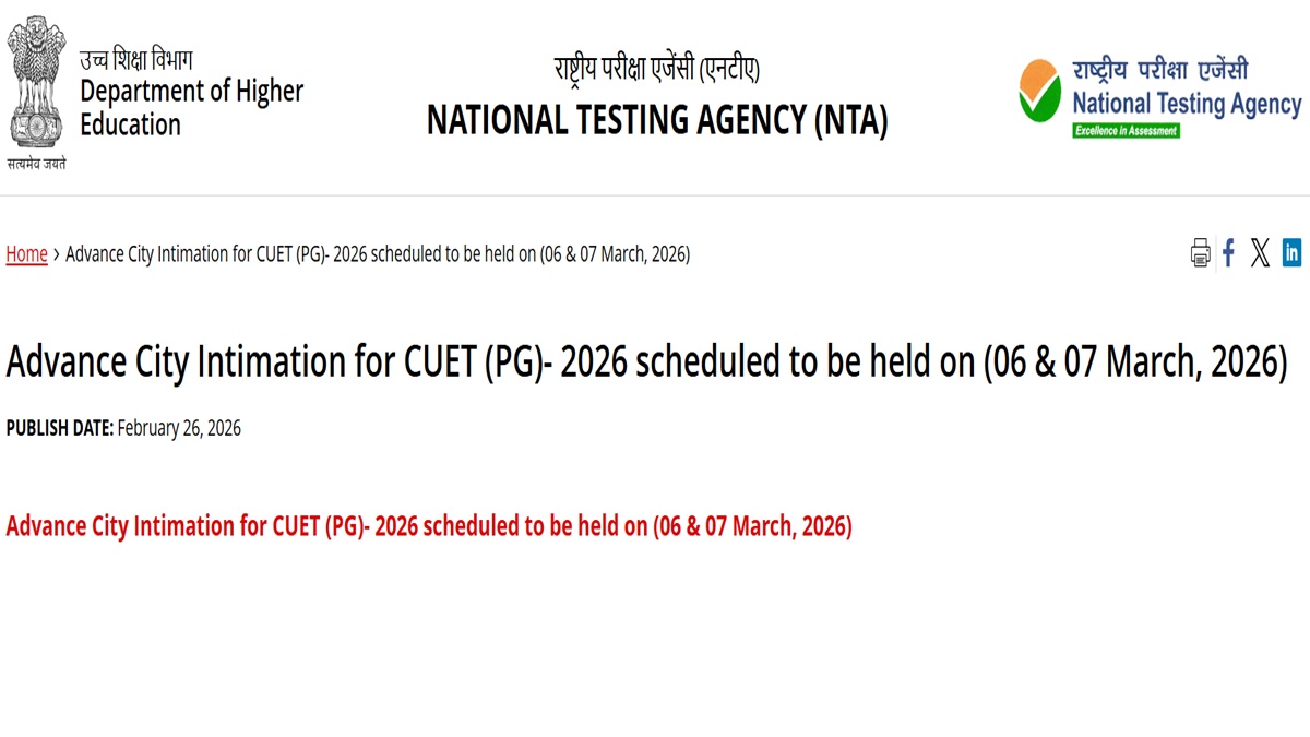 CUET PG 2026 Exam City Intimation Slip Released at exams.nta.nic.in, Admit Card to be Issued Shortly 16 hours ago