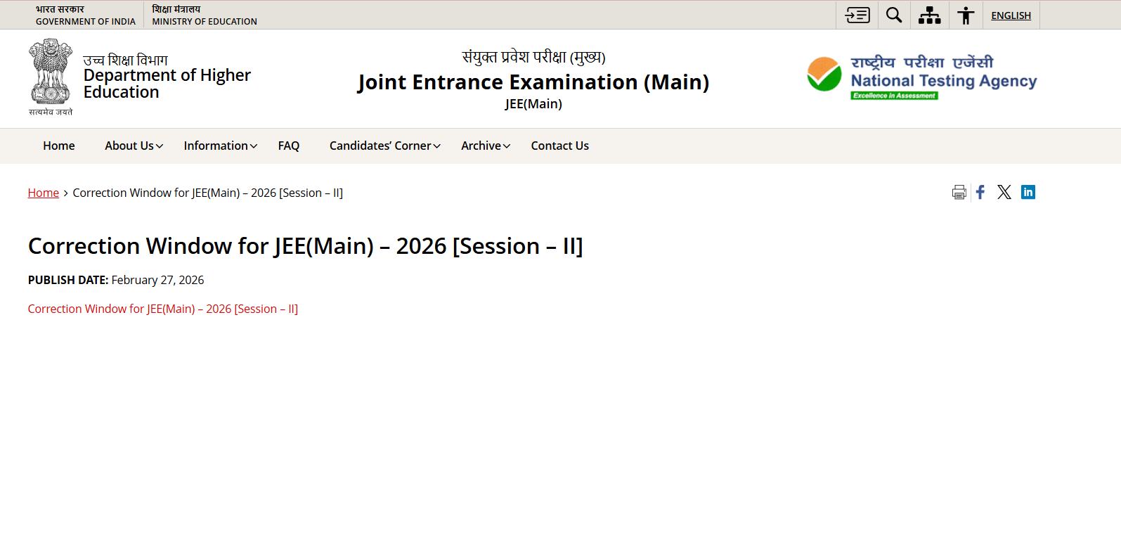 JEE Main 2026 Session 2 Correction Window Open at jeemain.nta.nic.in, Make Required Changes until Feb 28 14 hours ago