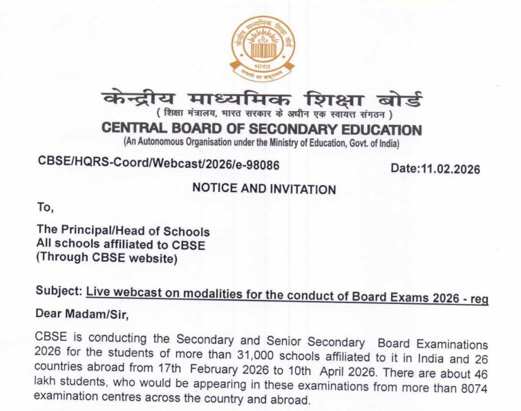CBSE Board Exams 2026: The Central Board of Secondary Education (CBSE) is holding a live webcast to explain the guidelines for the conduct of examinations and On Screen Marking (OSM) for the Secondary and Senior Secondary Board Examinations 2026.