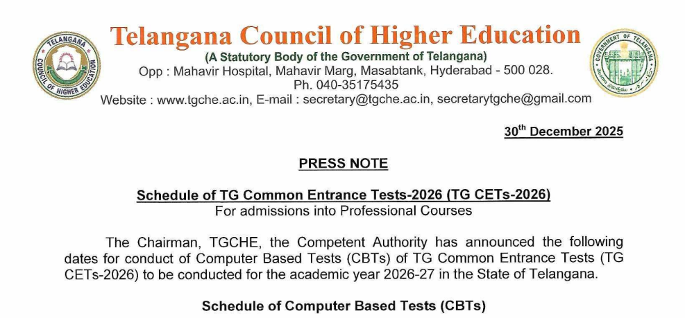 | TG EAPCET | B.E. / B.Tech. / B.Pharmacy / Pharma D. etc. | JNTUH | 4th & 5th May 2026 (Agricultural & Pharmacy) 9th, 10th & 11th May 2026 (Engineering) |