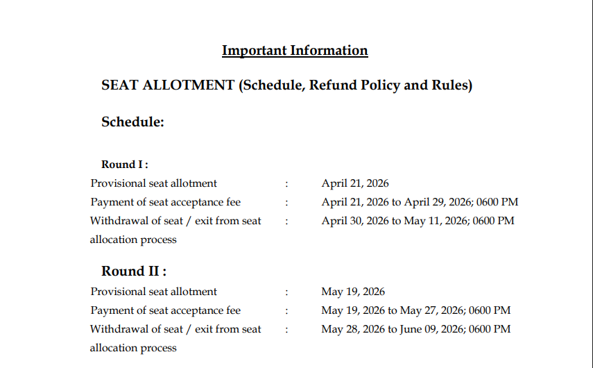 - Seat Acceptance Requirement: Selected candidates must immediately remit the seat acceptance fee before the deadline in their allotment letter, or their application will be cancelled.